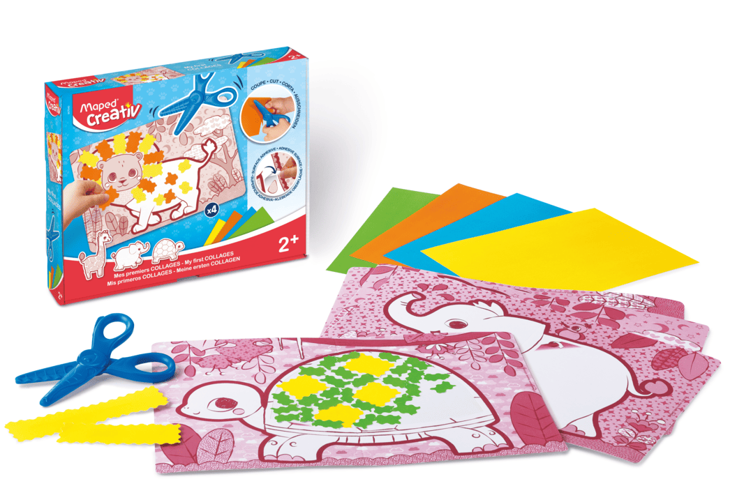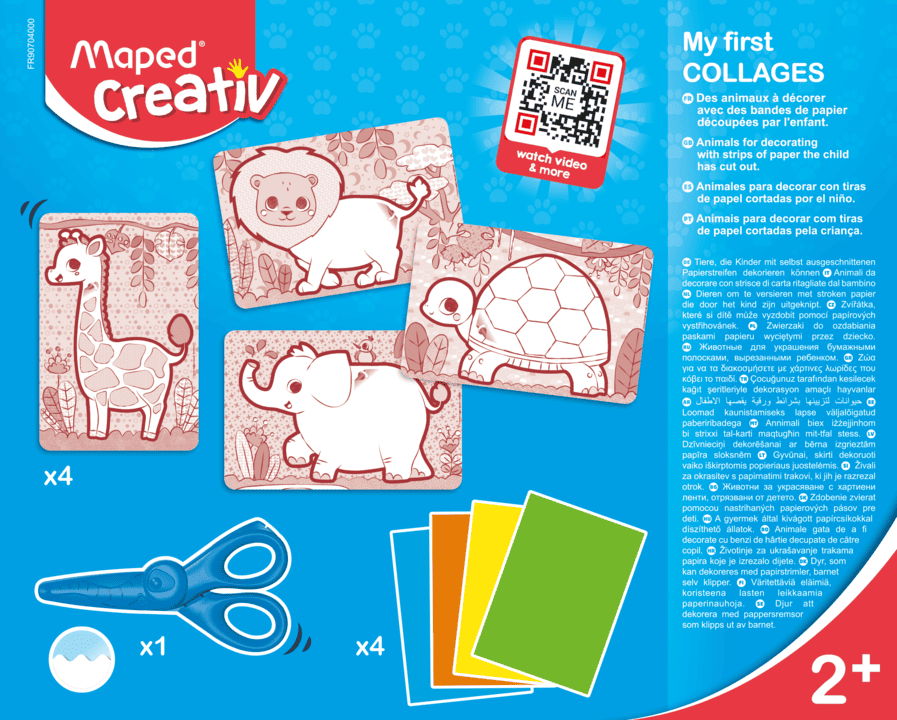 Maped Creativ Mis primeros collages. Un kit de manualidades único para presentar las actividades de collage a los más pequeños. Decora tarjetas de animales con tiras de papel recortadas por el niño. El contenido incluye: tijeras de seguridad redondeadas Maped, papel de colores y 4 divertidas plantillas de animales con adhesivos despegables. Apto para mayores de 2 años.